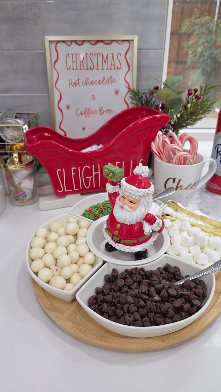 This was so fun to put together! We had Marshmallows, Chocolate Chips, Chocolate spoons (you can get them at Home Goods/Target etc.), Pepperridge Farm Gingerman Cookies, Peppermint Sprinkle, Candy canes, the Starbucks classic Hot cocoa & Hot Milk (I used a carafe for the same) ! All of these are linked here for your reference- Hot Chocolate Bar